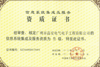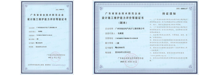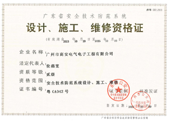 | 2001年10月至今 ● | 取得《广东省安全技术防范系统设计、施工、维修资格证(壹级)》 |